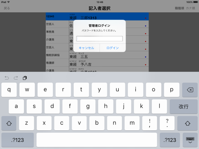 - 入力をスタートする前に、職員ごとにログインをします。パスワード認証で、セキュリティも安心です。