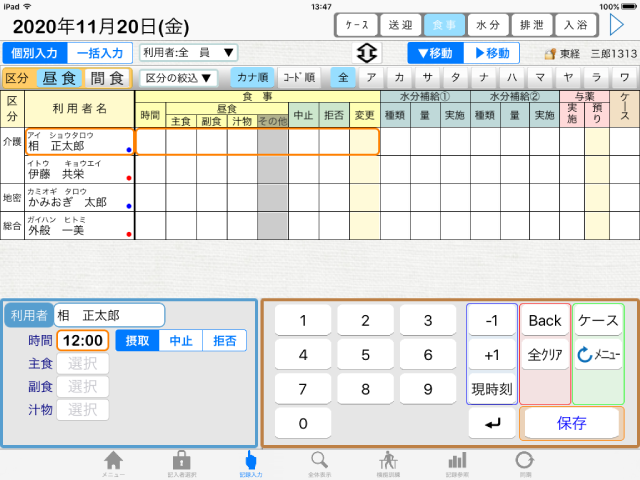 - ★食事摂取量や排泄の記号等、パソコンでの入力と同じマスタが表示されるので、直観的に操作できます。